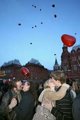 Старт массовым поцелуям был дан, когда организаторы выпустили в небо воздушный шарик - сердечко с руками. Молодежь завопила, в небо полетели другие алые шары-сердца, но целоваться начали немногие. По площади застенчиво прохаживались парни и девушки, держа у груди листочки с сердцами. Другие юноши размахивали надутыми презервативами. Но в общем и целом победило целомудрие.