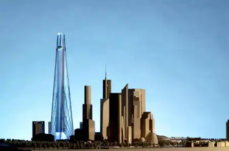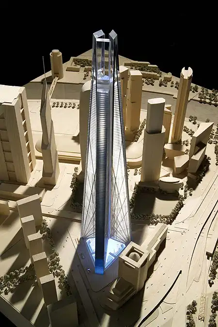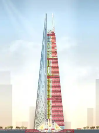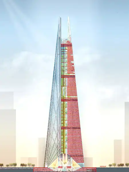 Башня будет многофункциональным комплексом - в ней разместятся офисные помещения, гостиница, апартаменты, подземный торговый центр и всевозможные досуговые учреждения. Максимальную эффективность конструкции обеспечивает ее треугольный план: три "руки", сужающиеся к верху, соединены центральной осью, проходящей по всей высоте здания.