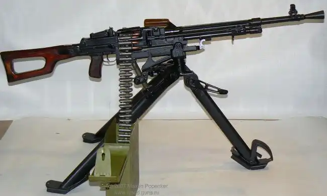 пулемет Калашникова ПКМ раннего выпуска, с лентой в 100-патронной коробке