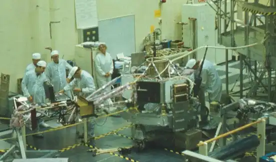 Рис. 2а - Межпланетная станция "Галилео" в монтажно-испытательном корпусе Лаборатории реактивного движения (JPL, Пасадена, США). На испытательном стенде установлен основной блок (орбитальный модуль), к нему впоследствии присоединят антенный модуль и спускаемый аппарат. Апрель 1988 г. Фото В.В. Шевченко. |