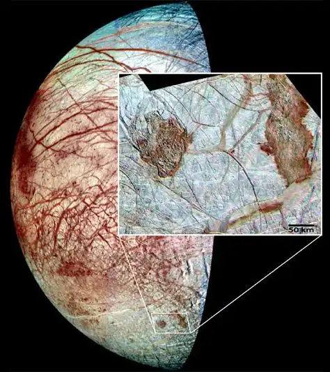 Рис. 9 - Комбинированный снимок поверхности Европы. Небольшой участок ледяной коры показан в увеличенном виде на врезке (масштабная единица 50 км). Видны ледяные поля, дрейфующие по поверхности подледного океана, глубина которого, возможно, более 100 км. Фото JPL/NASA. |