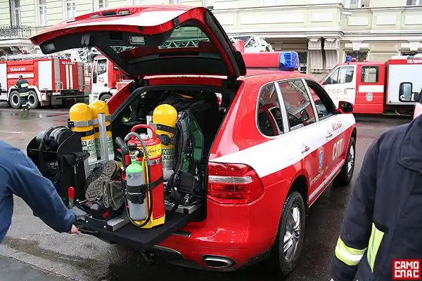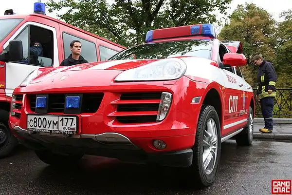 Это красавец Porsche Cayenne состоит на службе в компании "Самоспас". Самоспас является экипировочным центром, основным направлением работы которого пожарная безопасность - средства эвакуации при пожаре, устройства спасения и самоспасения с любых этажей в аварийной ситуации. В компании сотрудники МЧС, пожарной охраны, волонтеры Красного Креста и спасатели.