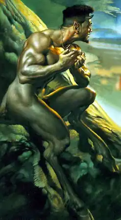 "Согласно мифам Пан — весёлый бог, сопровождаемый нимфами, бродивший по горам и лесам, плясавший, игравший на свирели. Представлялся древним грекам внешне безобразным, покрытым волосами, с рогами, козлиными копытами, бородой и хвостом; вызывал ужас (отсюда выражение "панический страх")."
