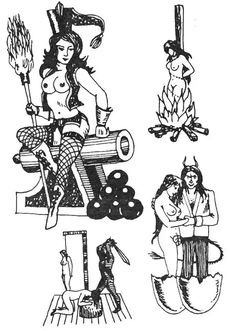42. Горящее распятие с женщиной. "На преступление толкнула женщина". "За измену отомщу". "Осуж-ден за убийство женщины".