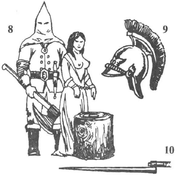 8. Палач с топором, полуобнаженная женщина, плаха. Татуировка встречается у лиц, осужденных за убийство родственника (или родственников). Вторичное значение "Смерть изменнице". Наносится на грудь.