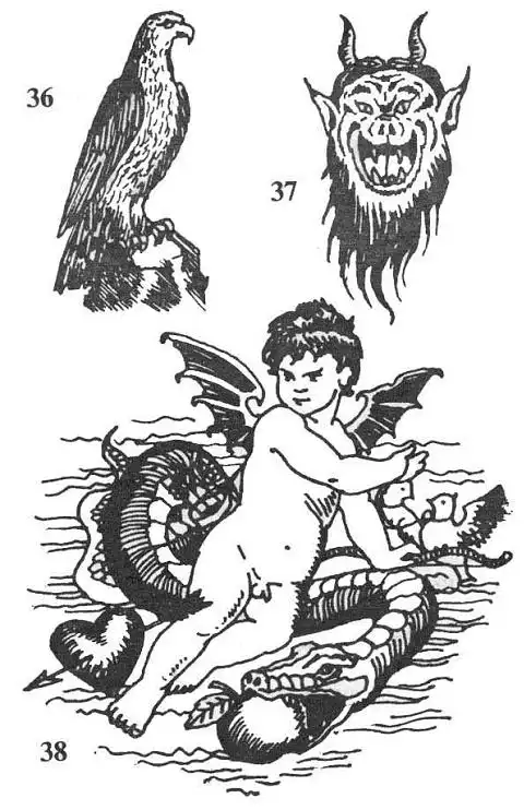 38. Амур с луком, змей-искуситель, голуби, пробитое стрелой сердце. Художественная татуировка. "Искушен тобой навеки". Наносится на грудь или спину.
