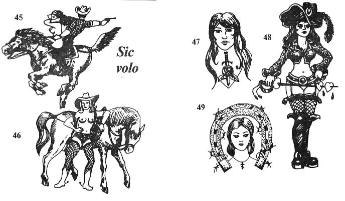 45. Ковбой с голой девушкой на коне. Рисунок может сопровождаться аббревиатурой "ОМУТ' ("От ме-ня уйти трудно"). Означает склонность к риску и авантюрам, Татуировка наносится на грудь.