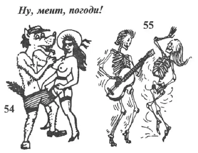 54. "Ну, волк, погоди!" Карикатура на сотрудника милиции. Часто волка изображают в форменной фу-ражке, кителе и с портупеей. Наносится на бедро и поясницу.