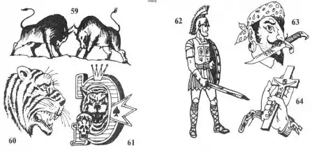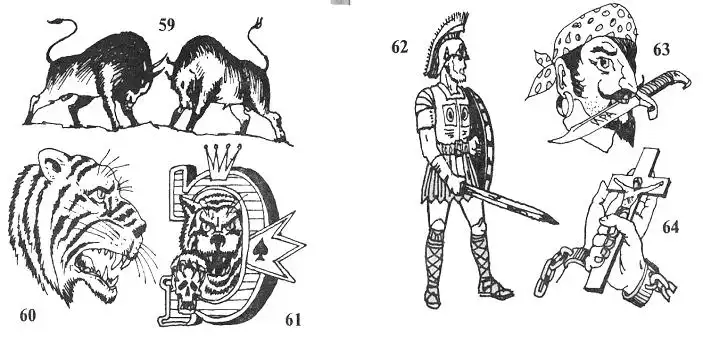 59. Дерущиеся быки. "Кто сильнее, тот и прав". Символизирует агрессию, борьбу за власть. Наносят ла-герные авторитеты. Рисунок может сопровождаться текстом. Место татуировки - грудь.