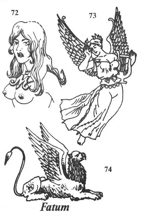 72. Женщина с обнаженной грудью. На груди - амулет в виде буквы "М" и короны. "Месть за измену". Символизирует агрессивность, насилие, жестокость.
