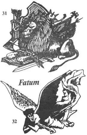 31. Лев в окружении средневекового оружия - меча, то пора, лука, стрел, булавы. Символизирует силу и власть. Лежащая перед львом книга означает мудрость. "Жесток, но справедлив". Татуировка авторите-тов. Наносится почта всегда на грудь.
