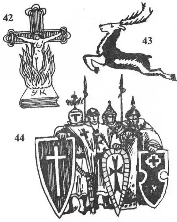 70. Рука с кинжалом, пронизывающая дьявола. Наколка антисемитов. "Бей жидов, спасай Россию!", "Убийство еврея не преступление, а очищение мира от посланников Сатаны". Подобные татуировки считались политическими и уничтожались.
