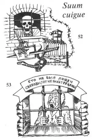 53. Зэк, плачущий за решеткой. "Будь проклят тот от века и до века, кто тюрьмой решил исправить че-ловека". Наносится на грудь или спину. Как и предыдущая наколка, указывает на лагерного старожила.