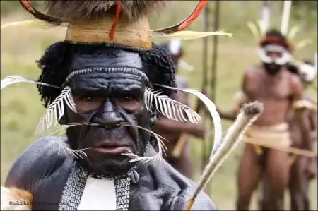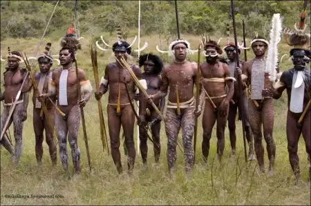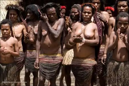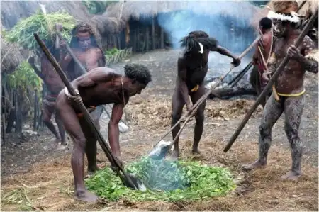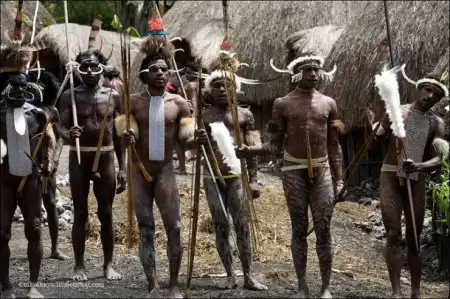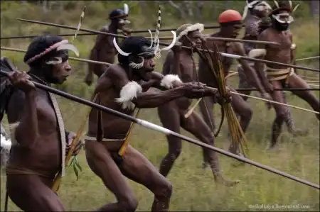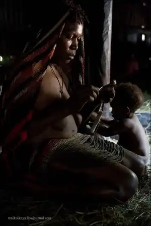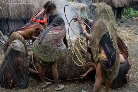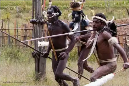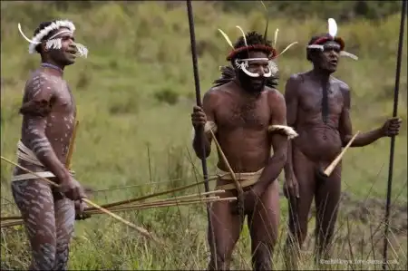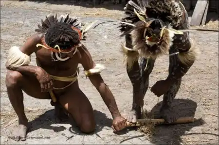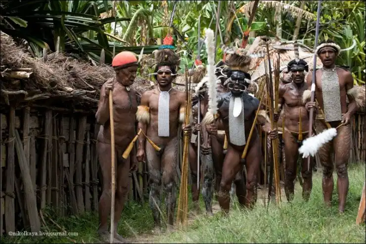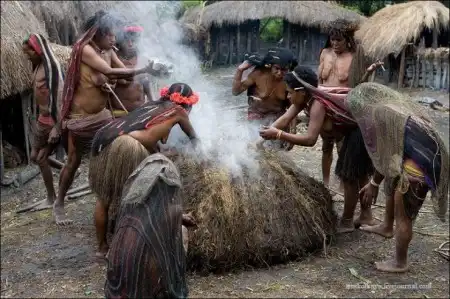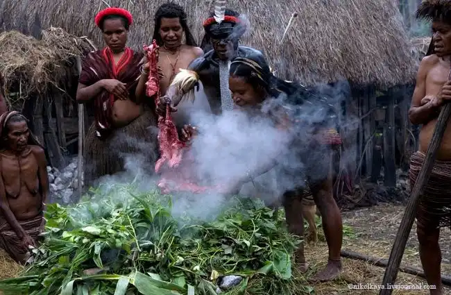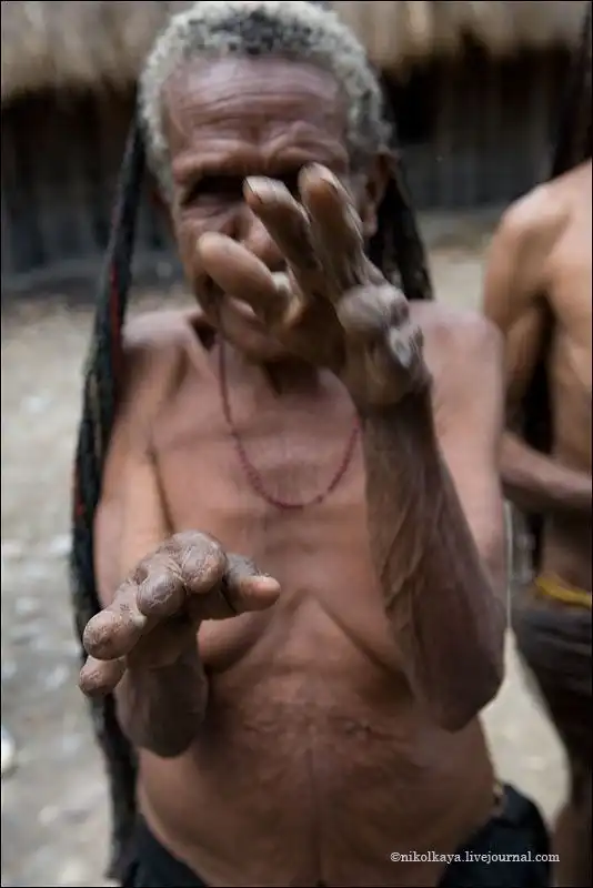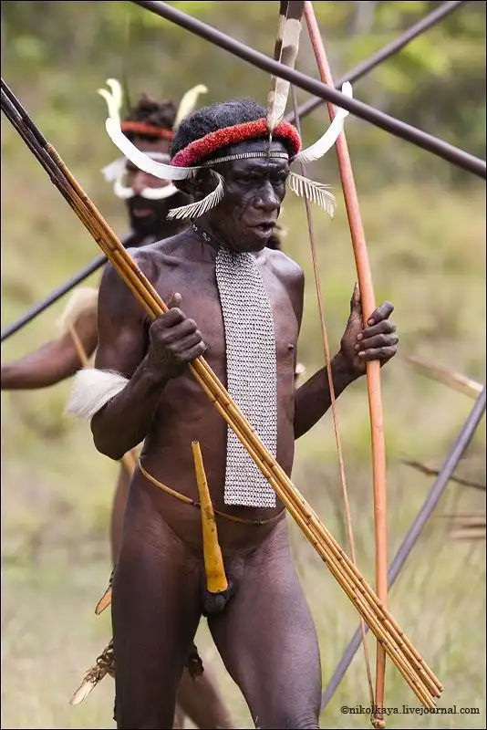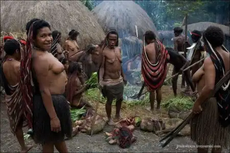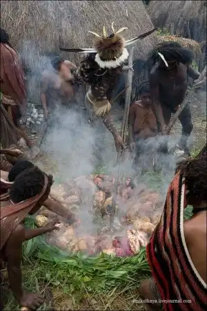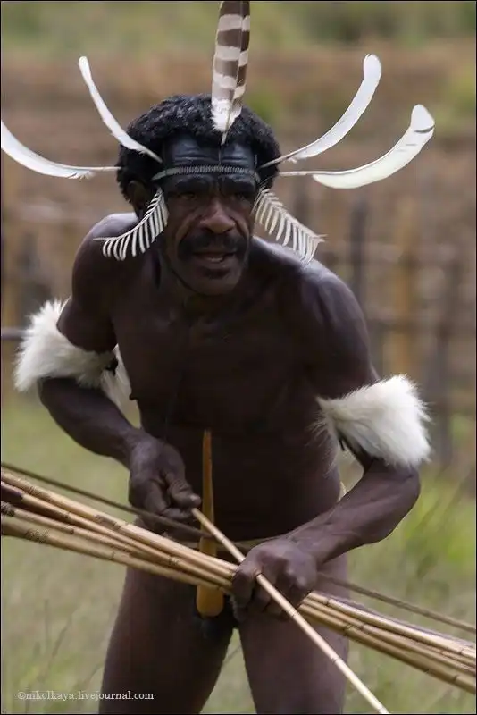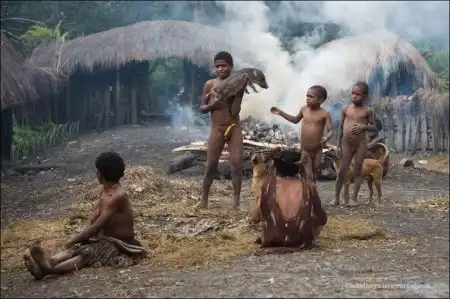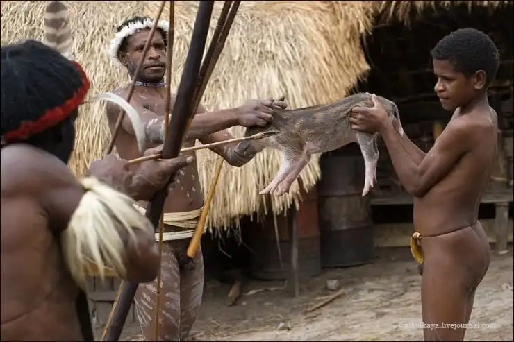 Дани охотятся на казуаров, кус-кусов («большая мышь» в руках у мальчика) и диких кабанов. Иногда случается, что убивают свинью из соседней деревни. Тогда начинается война, которая может длиться годами. Сломают друг другу подвесной мост, или забор подожгут - и пошло-поехало. Казуар - редкая огромная птица весом до 80 кг , встречается только в Новой Гвинеи. Из кости птицы Дани делают ритуальные ножи, мелкие косточки идут на украшения, перья мужчины вставляют в волосы. Обычные ножи делают из бамбука. Когда умирает какой-нибудь близкий родственник (муж, брат, дети), женщинам отрубают фаланги пальцев каменным топором (топор на фото), по одной фаланге за каждого родственника.