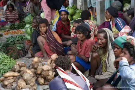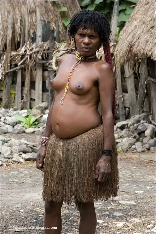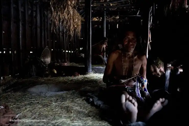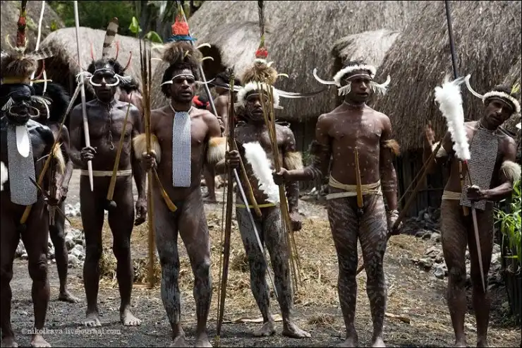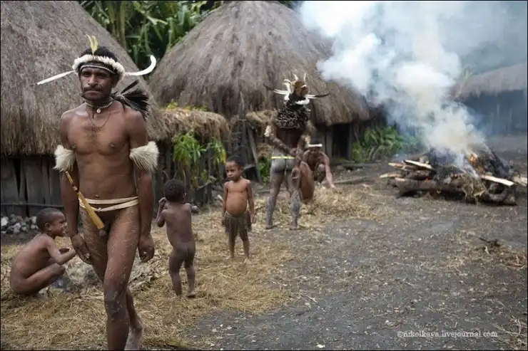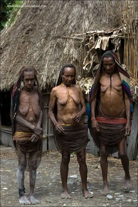 Племена Дани живут большими семьями общим двором по 30-50 человек. Женская половина вместе с кухней и свинарником, но отдельно от мужского дома, куда нас не пустили. Есть специальный дом для ночных свиданий супругов, по очереди. У Дани может быть несколько жен. Одна жена стоит 4-5 свиней. У главы семьи, где были мы (на фото) - 4 жены, 8 детей (4 сына, двое из них женаты и имеют по 2 жены). Свинья стоит очень дорого. Наш поросенок - 100 долларов, большая свинья - до 3 тысяч. К примеру, огромная корова стоит всего 300 долларов. Мы не хотели, чтобы нашего поросенка убили и съели, мы думали, что он будет жить в семье. Нас не поняли.