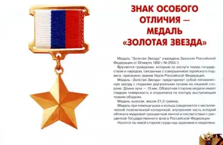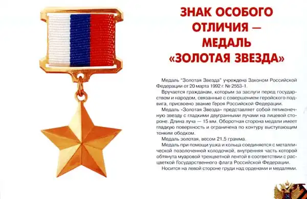 Медаль «Золотая Звезда» — государственная награда СССР и РФ, установлена как дополнительный знак отличия к званию Героя (с 1939 - к Герою Советского Союза, с 1992 - к Герою России).