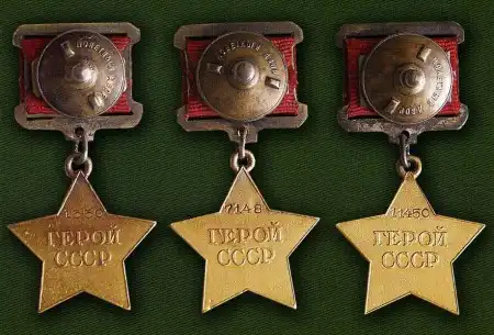 4. На оборотной стороне в центре медали расположена надпись выпуклыми буквами: «Герой СССР» (первые несколько месяцев существования медали текст на обратной стороне гласил «Герой СС»)[1]. Размер букв 4*2 мм, в верхнем луче — номер медали, высотой в 1 мм.