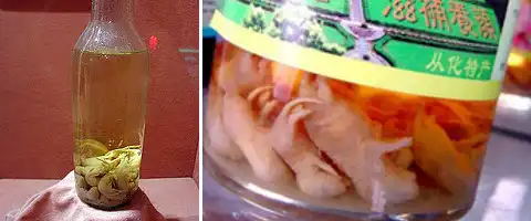 Этот традиционный оздоровительный напиток пьют в Китае и Корее, на вкус он, говорят, как керосин. Маленькие мышата, еще слепые, лежат в бутылках рисового вина. Трогательно.