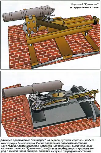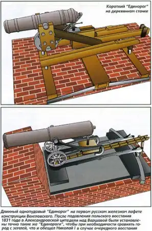 В первые годы XIX века происходит реорганизация русской сухопутной артиллерии, которой руководил граф Алексей Аракчеев. Он ввел систему орудий образца 1805 года. Скажем сразу, что никаких революционных технических решений в новых системах не было. Просто введено единообразие, существенно облегчены все артсистемы, с тел орудий убрали излишние украшения. А к середине 1860-х годов «Единороги» были выведены из полевой артиллерии. Но их боевая служба на этом не закончилась. В 60-80-х годах XIX века наши броненосные суда вооружались 8-12-дюймовыми (203-305 мм) нарезными пушками, но многочисленные паровые шхуны на Черном и Каспийском морях и в Сибирской флотилии по-прежнему вооружались небольшими «Единорогами». Сохранялись «Единороги» и в крепостях. К 20 января 1868 года на вооружении Кронштадтской крепости имелось 250 однопудовых и 41 полупудовый «Единорог». А к началу 1890 года в четырех лучших русских сухопутных крепостях Новогеоргиевске, Бресте, Ивангороде и Варшаве (Александровская цитадель) насчитывалось 121 однопудовый и 282 полупудовых «Единорога».