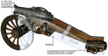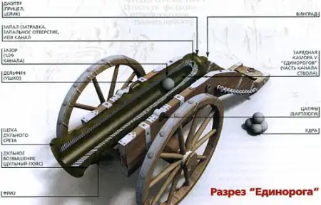 До введения «Единорогов» в русской и в других европейских армиях на вооружении были пушки длиной 18-25 калибров (длина в калибрах – отношение длины ствола орудия к диаметру канала) и гаубицы длиной 6-8 калибров. Пушки не имели зарядных камор. И канал у них переходил в плоское или полушарное дно, а гаубицы имели цилиндрические каморы. Зарядная камора у гладкоствольных орудий – это задняя часть канала орудия с уменьшенным диаметром, предназначенная для помещения картузного заряда. В пушках и ряде других орудий камор не было, и они назывались бескаморными. Со второй половины XIX века каморой стали называть часть канала между дном снаряда и затвором.
