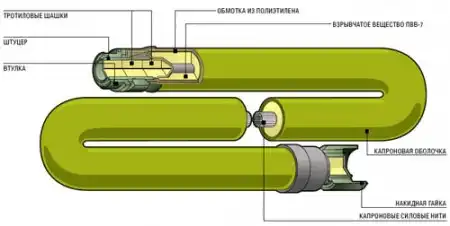 Секция детонирующего кабеля ДКПР-4 представляет собой гибкую пластиковую трубу длиной 10,3 метра и диаметром 7 см. Внутри она набита пластичной взрывчаткой ПВВ-7 (40,25 кг). Секции взрывного кабеля соединяются друг с другом с помощью накидных гаек.