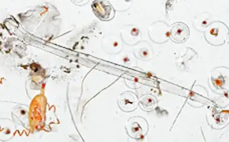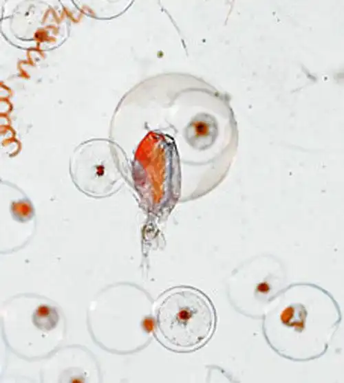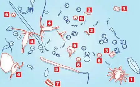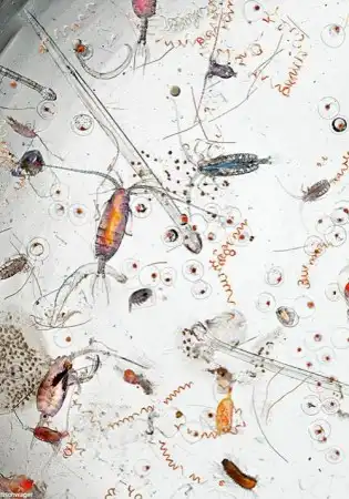 Планктон составляют многие бактерии, водоросли, простейшие, кишечнополостные, моллюски, ракообразные, оболочники, яйца и личинки рыб, личинки многих беспозвоночных животных …На этой фотографии хорошо можно разглядеть жителей морских глубин…
