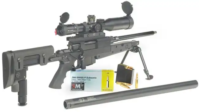 снайперская винтовка Brugger & Thomet APR 308 с интегральным глушителем, снятым со ствола для чистки или транспортировки