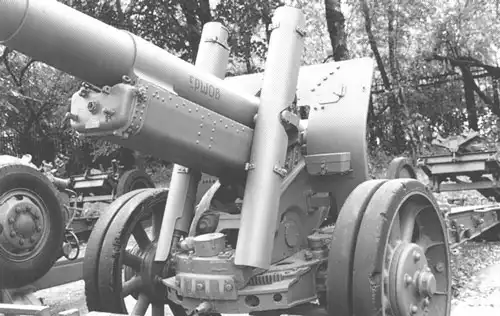 И самым серьезным недостатком было совмещение подъемного и уравновешивающего механизма в одной системе. Скорость вертикальной наводки за один оборот маховика не превышала 10 минут, что было предельно мало. Наконец, система 1934 г. хоть и именовалась гаубицей, но угол возвышения у нее был +45°. Для гаубиц 30-х гг. такой угол возвышения был слишком мал.