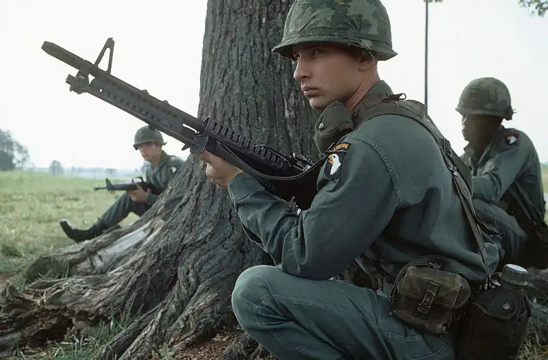 Боец 101й парашютно-десантной дивизии США вооруженный пулеметом М60 во время учений в Оклахоме.