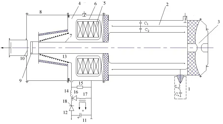 Ускоритель работает следующим образом: начальное магнитное состояние сердечника согласующего трансформатора задается током, протекающим по цепи индуктивностей 13 и 14, катододержателя 7 и витков 6 при разряде конденсатора 11. Конденсатор 11 предварительно заряжается от внешнего источника до напряжения, обеспечивающего протекание тока размагничивания величиной 150 – 200 А. После зарядки конденсатора на управляющий вывод 18 тиристора 12 узла размагничивания подается импульс запуска с блока управления ускорителем. Тиристор открывается и начинается процесс разрядки конденсатора. В момент перехода тока из цепи тиристора 12 в цепь диода 16 (см. фиг. 1), дроссель насыщения 17 формирует импульс на запуск генератора импульсного напряжения, после срабатывания которого начинается формирование основного импульса напряжения.