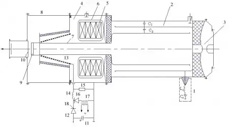 Для насыщения материала ферромагнитного сердечника трансформатора до стадии формирования основного импульса напряжения введен узел принудительного размагничивания. Он состоит из конденсатора 11, тиристора 12, индуктивности размагничивания 13, развязывающей индуктивности 14, шунтирующего сопротивления 15, защитного диода 16 и дросселя насыщения 17.