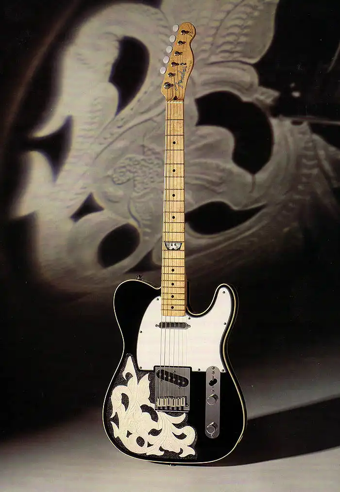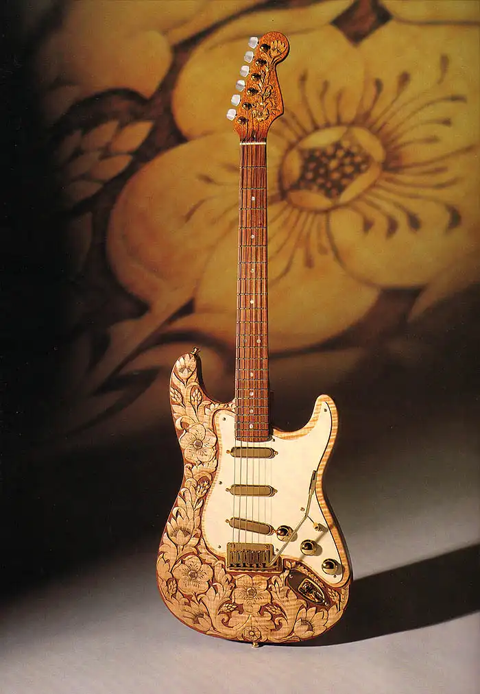 Стоит заметить, что все узоры, которые Вы видите на корпусе и грифе гитар ничто иное как резьба по дереву. Это тонкая работа, выполненная один из лучших мировых мастеров, простым рабочим отдела Custom Shop компании Fender George Amicay. Никаких машин, только нож для резьбы и руки мастера :yes: