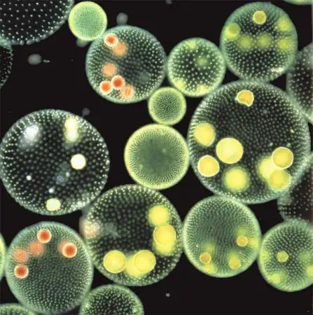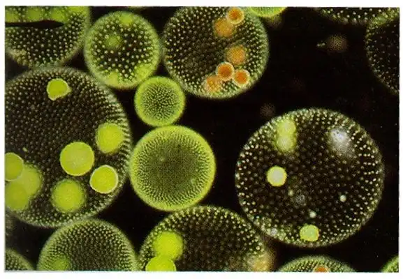 В прудах и озерах можно найти плавающие в воде зеленые округлые организмы диаметром до 1 мм. Это вольвокс. Под микроскопом видно, что каждый такой шарик состоит из множества (около 1000) клеток, похожих на зеленую эвглену.