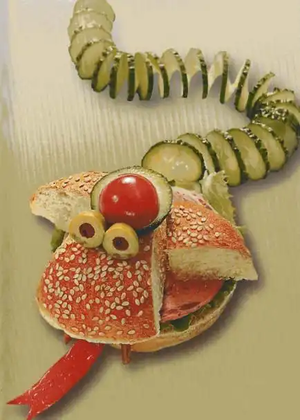 Вам потребуется: 1 булочка, 1 ломтик вареной колбасы, 1 ломтик салями, 2 маринованные стрелки чеснока, 1 зеленая оливка без косточки, 1 кусочек вареной моркови, 1 зернышко кукурузы, 2 икринки, 1 маленький стручок красного перца, 1 соленая соломка, 1 лист зеленого салата, сливочное масло или майонез.