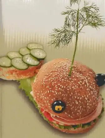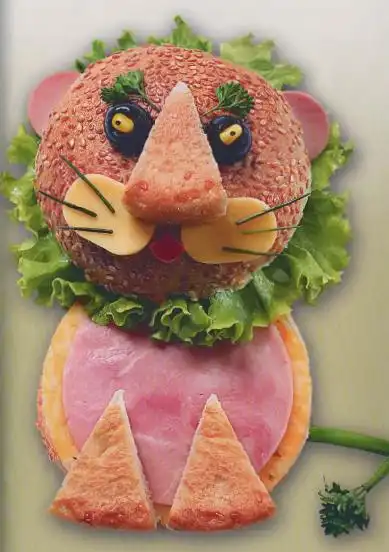 Вам потребуется: 1 булочка, 1 ломтик сыра, 1 ломтик ветчины, 1 кусочек сыра оранжевого цвета, 1 кусочек мраморного сыра, 1 ломтик вареной колбасы, 1 ломтик салями, 2 зернышка кукурузы, 3 икринки, 1 лист зеленого салата, 1 веточка петрушки, сливочное масло или майонез.