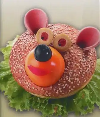 Вам потребуется: 1 булочка, 4 ломтика сыра, 2 ломтика вареной колбасы, 1 черная маслина без косточки, 2 зернышка кукурузы, 2 икринки, 2 листа зеленого салата, 1 веточка петрушки, сливочное масло или майонез.