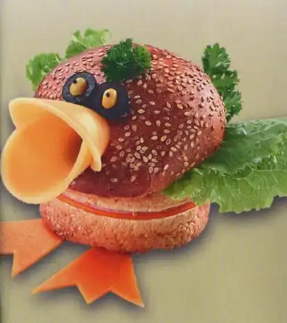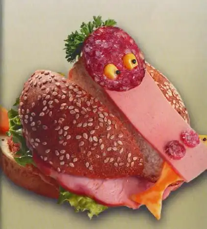 Вам потребуется: 1 булочка, 2 ломтика сыра, 1 ломтик ветчины, 1 ломтик вареной колбасы, 1 черная маслина без косточки, 2 зернышка кукурузы, 2 икринки, 1 кусочек красного сладкого перца, 6 перышек зеленого лука, 1 лист зеленого салата, 1 веточка петрушки, сливочное масло или майонез.
