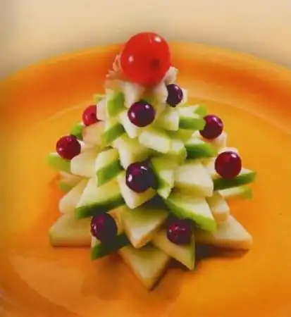 3. Продолжать выкладывать звездочки, чередуя их с выложенными веером кусочками яблока, оставшегося после вырезания звездочек. Верх елочки - самая маленькая звездочка.