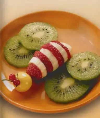2. От целой клубники отрезать две тонкие пластиночки. Выложить из них "рот". Положить сверху кусочек банана. Это "голова". Уложить на "голову" два кружочка банана - "глаза". "Зрачки" сделать из зернышек киви.