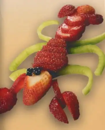 4. Третью клубничку нарезать вдоль на домтики. Отложить два крайних ломтика в сторону, оставшиеся выложить в виде чешуек. Это "раковая шейка". Приставить "шейку" к "панцирю", из оставшихся ломтиков клубники выложить "хвост".