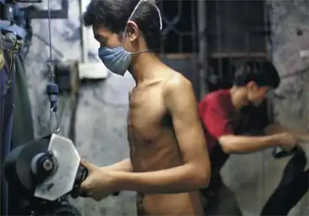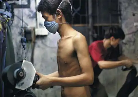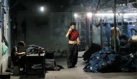 Безлунная ночь спустилась на старый кирпичный склад в Чжуншане, одном из быстро растущих городов Южного Китая. Внутри все залито ярким неоновым светом. Тысячи пар джинсов — помещение просто забито ими. Рабочие в бешеном темпе шлифуют ткань, стремясь придать ей вид элегантной потертости. Машины, которыми они пользуются, — неуклюжие, шумные механизмы, свисающие с потолка, — снимают с ткани верхний слой, наполняя воздух липкой синей пылью. Пыль оседает на коже и забивает легкие.