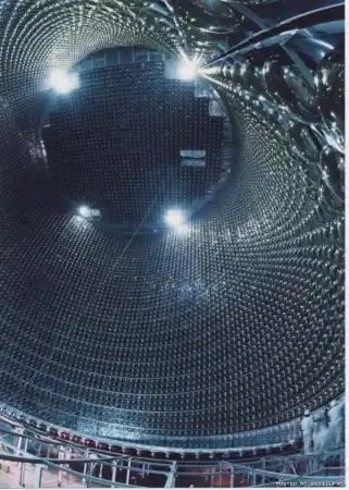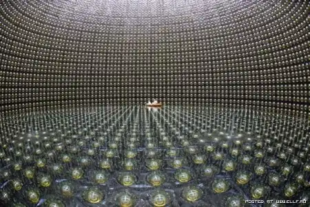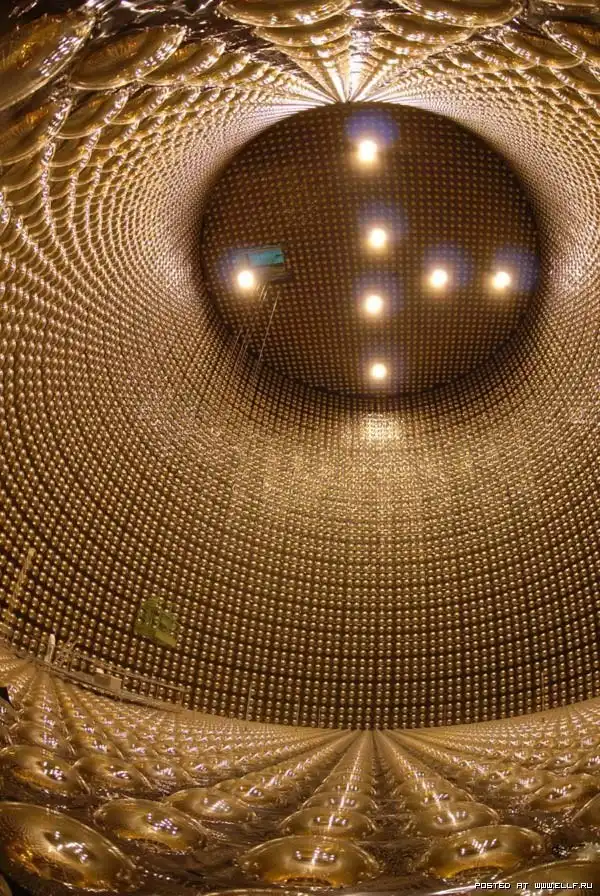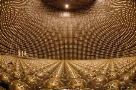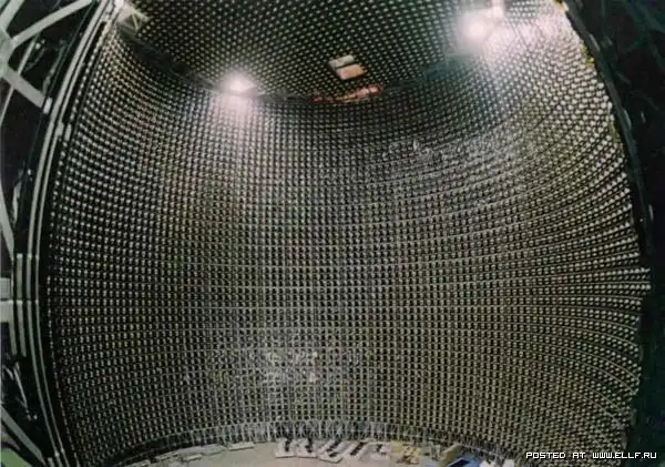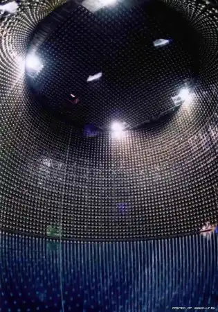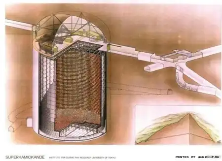 Потрясающее зрелище супер-Камиоканде представляет из себя огромный подземный резервуар (цилиндр диаметром 39 и высотой 41 м), заполненный 50 тысячами тонн сверх чистой водой. На стенках резервуара размещены 11 тысяч фото умножителей, "просматривающих" весь объем воды и регистрирующих черенковское излучение частиц. Большая толща грунта над установкой защищает ее от фона космических лучей, так что в объеме установки происходят лишь редкие события из которых наиболее интересны те, что вызваны солнечными или атмосферными нейтрино. В программе исследований также поиск распада протона, регистрация нейтрино от взрывов сверхновых, ускорительных и астрофизических нейтрино.
