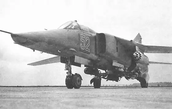· МиГ-23БМ ("изделие 32-25") - истребитель-бомбардировщик для советских ВВС, прототип МиГ-27. Отличался цифровым прицельно-навигационным комплексом ПрНК-23 и двигателем Р-29Б-300. Разработан в 1972 году на базе МиГ-23Б и МиГ-23БН. Первый полёт 17 ноября 1972 года (лётчик-испытатель В.Е.Меницкий).