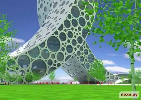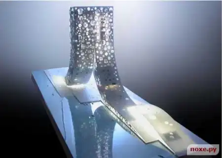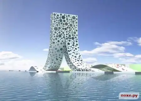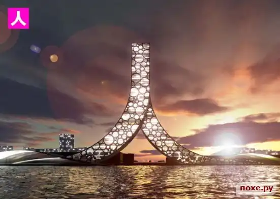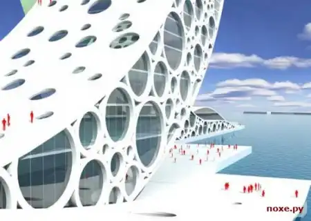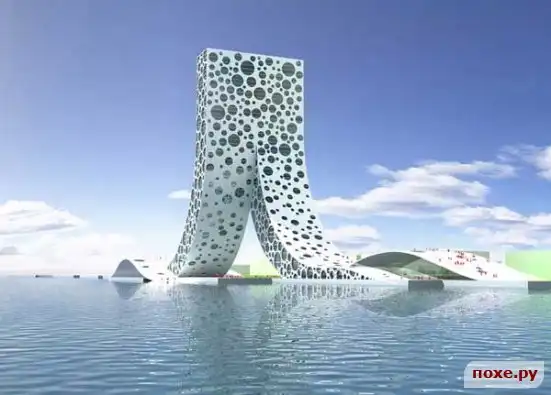 Первое здание, выходящее из воды, это спортивный и культурно-досуговый центр. Второе здание, выходящее из земли, это общественный и конференц центр.В месте пересечения этих зданий высоко над уровнем земли - начинается отель на 1000 номеров. Спроектировано оно в форме иероглифа «ren», что в переводе означает "люди".