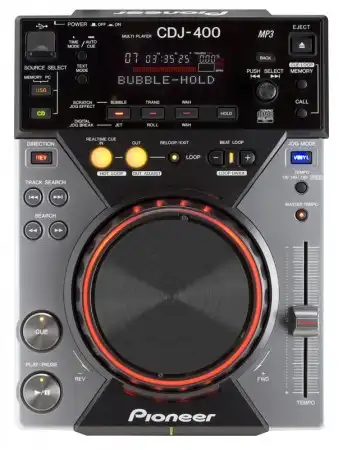 Pioneer CDJ-400. Одна из последних разработок. Этот агрегат можно синхронизировать с компьютером или ноутбуком, также просто вставить флэшку в USB и играть с нее. Так-же есть функция Vinyl - нажатием одной кнопки JOG начинает делать это чудное "вжик-вжик".