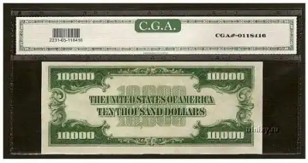Фактически это не денежная купюра, а золотой сертификат, который служил исключительно в целях расчетов между финансовыми учреждениями США. Всего таких банкнот было выпущено 42 000 штук. На сегодняшний день они служат исключительно в образовательных целях.