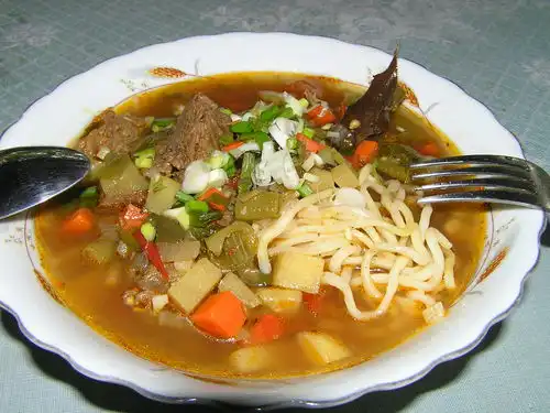 В таких случаях лагман в бульоне подают в касе и к нему закуски из свежих и маринованных овощей и зелени.