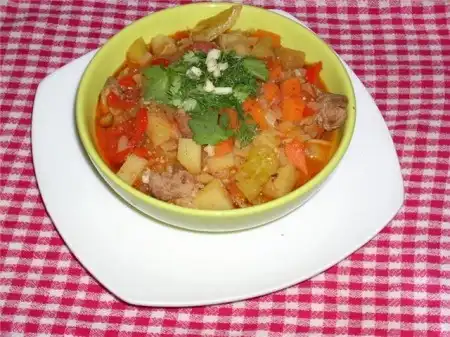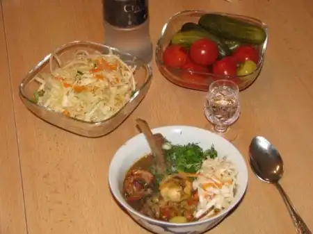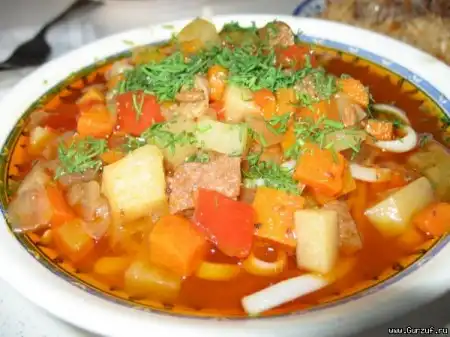 Разогревают котел, наливают растительное масло, раскапывают его, кладут мясо и через 4 минут репчатый лук. Жарят на сильном огне, непрерывно помешивая. Еще раз 23 минуты в котел кладут другие резанные овощи Дюцай и сельдерей жарят 2 минуты, зеленый лук, чеснок и перец 34 минуты, соленые и квашенные овощи 4 минут, остальные из перечисленных овощей после жарки еще и с добавлением воды тушатся 6 минут, а редька, картошка - 10-12 минут