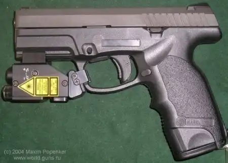 Пистолет Steyr M-A1 калибра 9мм, вариант с предохранителем. Предохранитель выключен, под стволом установлен лазерный прицел.