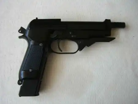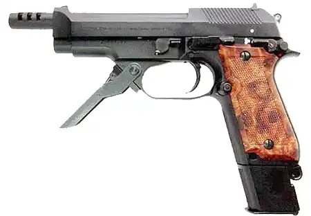 Правда, что-то напоминает? Ну да. Это "Беретта", только не простая. Модификация М93R. Выпущенный в 1973 г. штурмовой пистолет 93R выполнен на основе самозарядного пистолета М92, но способен вести огонь как одиночными выстрелами, так и очередями по три выстрела. Для большей устойчивости при стрельбе очередями на дульной части ствола имеется компенсатор реактивного действия, который действует также как пламегаситель. Рамка пистолета такая же как, в модели 92, но на правой стороне рукоятки размещен переключатель механизма контроля стрельбы очередями, а впереди спусковой скобы выполнено своеобразное "цевьё" на котором располагается складывающаяся дополнительная рукоятка. К пистолету прилагается металлический складной приклад, который обеспечивает устойчивый упор в плечо при стрельбе очередями. Опять же, засветился в культовом фильме 80-х "Робот-полицейский" у самого главного героя, только там он обвешан накладками.